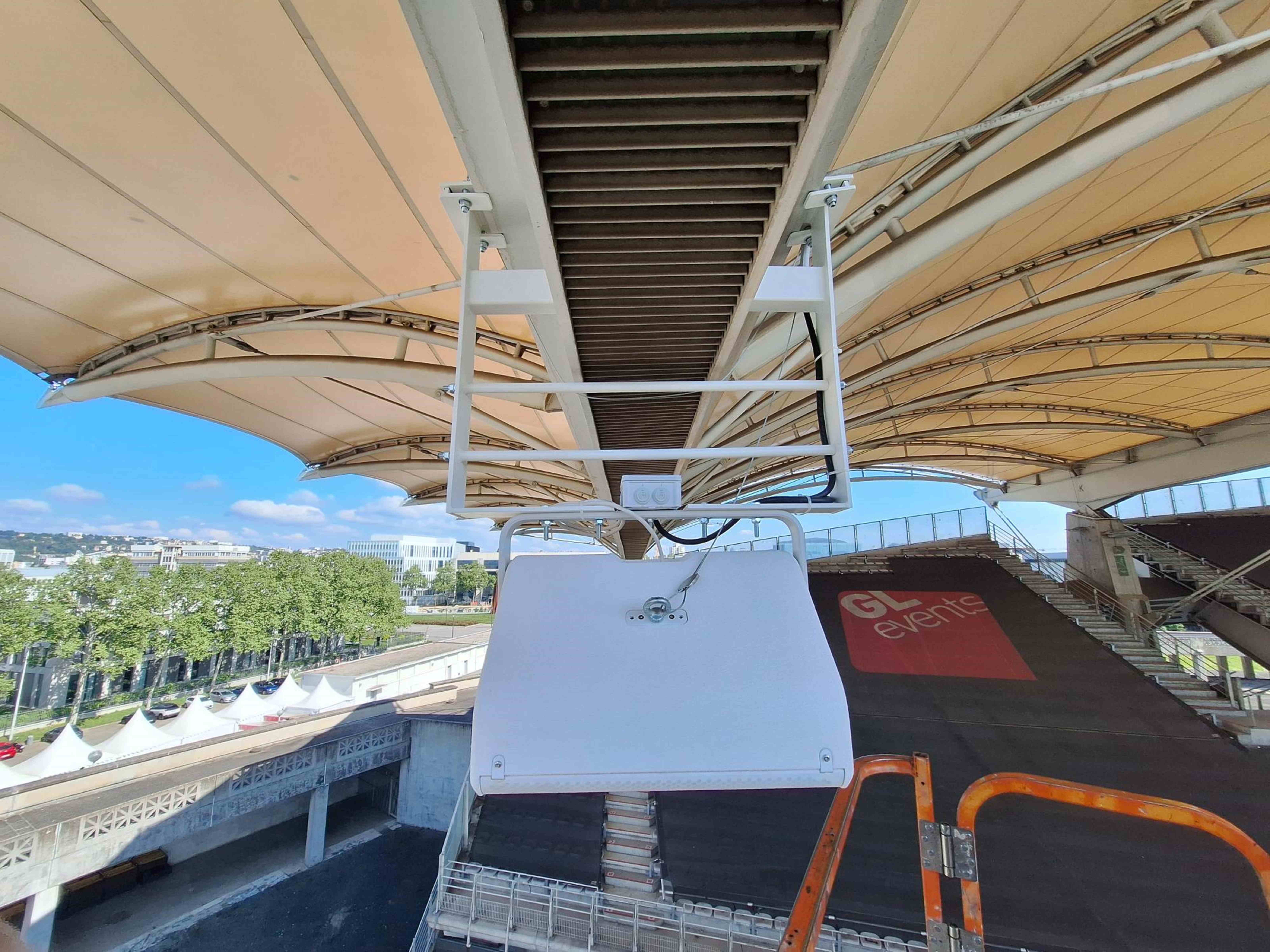 GL events Audiovisual & Power's staff installed NEXO speakers at a height of 25 meters under each bend of the Matmut Stadium stands, using aerial platforms and rope access. There are six P12 speakers and ten ePS10 speakers under each stand.