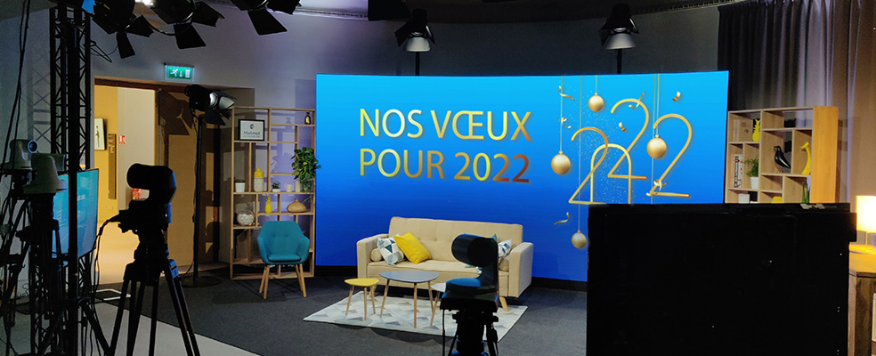 Que vous choisissiez des vœux en streaming ou en multiplex, vous aurez besoin d’aménager un espace pour vos intervenants. Quels que soient vos besoins, vous pouvez agencer un studio TV mobile et temporaire : dans vos locaux pour les budgets les plus serrés ou pourquoi pas dans un site événementiel pour un effet waouh garanti.